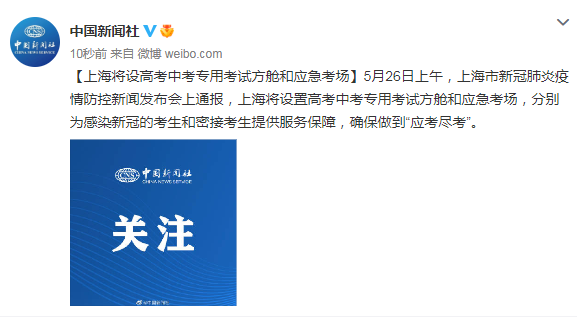 5月26日上午,上海市新冠肺炎疫情防控新聞發(fā)布會上通報,上海將設(shè)置高考中考專用考試方艙和應(yīng)急考場,分別為感染新冠的考生和密接考生提供服務(wù)保障,確保做到“應(yīng)考盡考”。