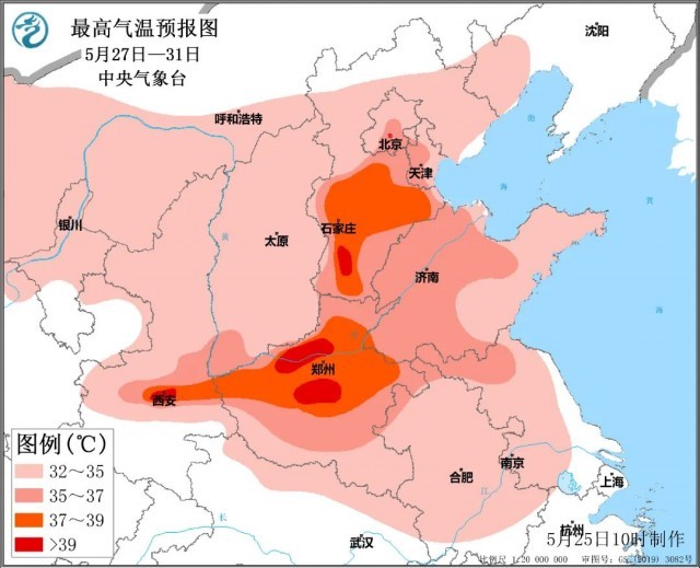 5月27日至31日,西北地區(qū)東部、華北、黃淮、江淮等地將有一次高溫天氣過(guò)程,其中,京津冀地區(qū)、河南、山東中西部、蘇皖北部、陜西關(guān)中等地最高氣溫在35℃以上,河北南部、河南中西部、陜西關(guān)中等地超過(guò)37℃,局地可達(dá)39~40℃。