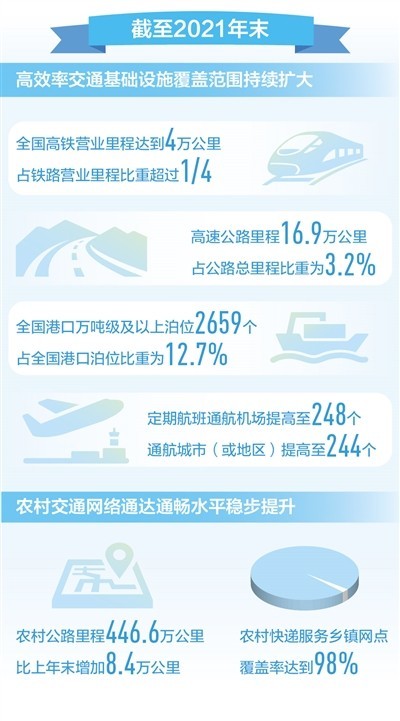 高效率交通基礎(chǔ)設(shè)施覆蓋范圍持續(xù)擴大。截至2021年末,全國高鐵營業(yè)里程達到4萬公里,占鐵路營業(yè)里程比重超過1/4。高速公路里程16.9萬公里,比上年末增加8090公里,占公路總里程比重為3.2%,呈現(xiàn)穩(wěn)步提高態(tài)勢。全國港口萬噸級及以上泊位2659個、增加67個,占全國港口泊位比重為12.7%、提高1個百分點。定期航班通航機場、通航城市(或地區(qū))分別提高至248個和244個。