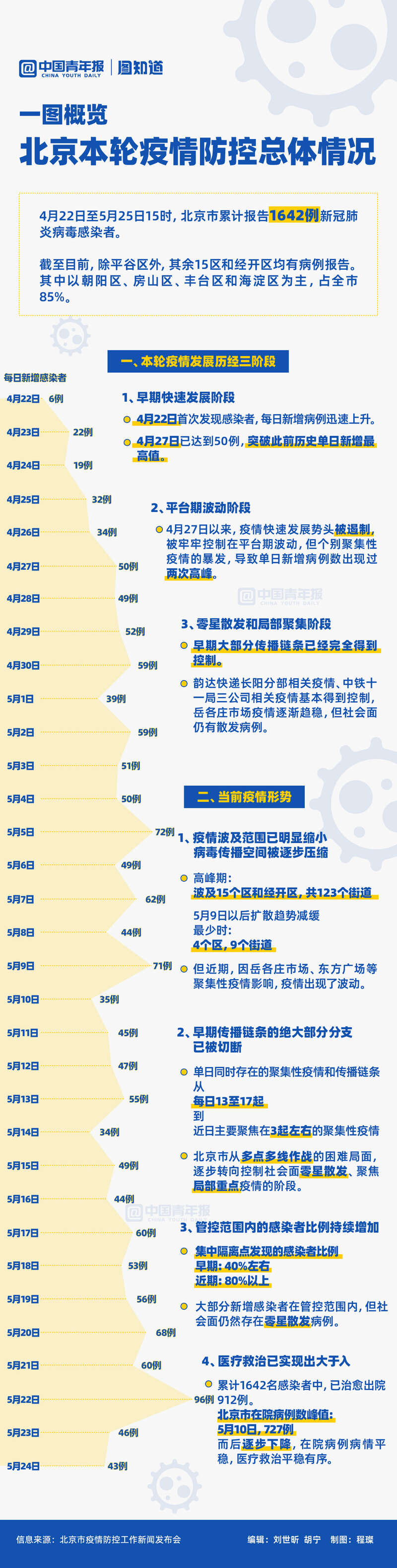 4月22日至5月25日15時,北京市累計報告1642例新冠肺炎病毒感染者,除平谷區(qū)外全市各區(qū)均出現了病例。超大城市迎戰(zhàn)奧密克戎,難之又難的以快制快之戰(zhàn)打得怎么樣、當前北京疫情形勢如何?一圖回顧。