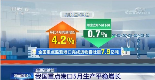 央視網(wǎng)消息:5月26日,交通運(yùn)輸部發(fā)布數(shù)據(jù)顯示,5月以來,全國(guó)港口航道保持暢通,主要生產(chǎn)指標(biāo)穩(wěn)定向好。