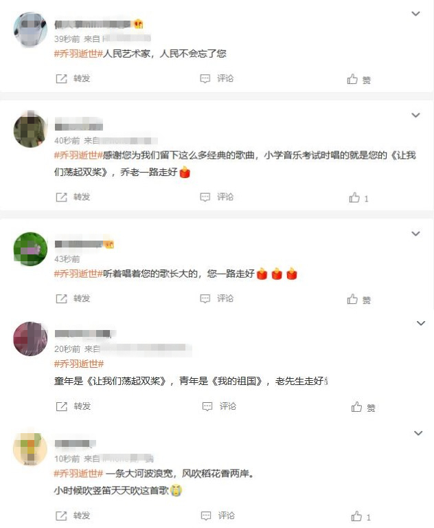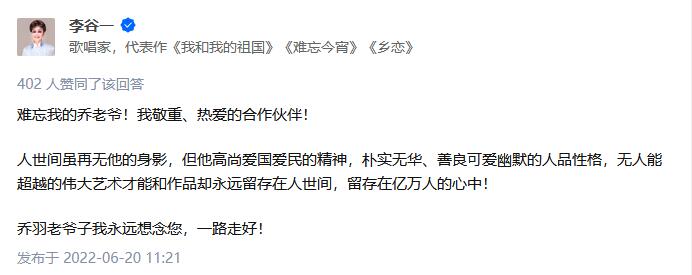 李谷一在聽聞喬羽逝世的消息后,第一時間發(fā)文悼念:“難忘我的喬老爺!我敬重、熱愛的合作伙伴!人世間雖再無他的身影,但他高尚愛國愛民的精神,樸實無華、善良可愛幽默的人品性格,無人能超越的偉大藝術才能和作品卻永遠留存在人世間,留存在億萬人的心中!喬羽老爺子我永遠想念您,一路走好!”