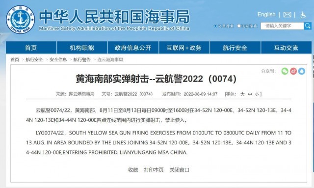 江蘇連云港海事局日前發(fā)布航行警告,今起(8月11日)至13日每日9時至16時在黃海南部海域進行實彈射擊,禁止駛入。