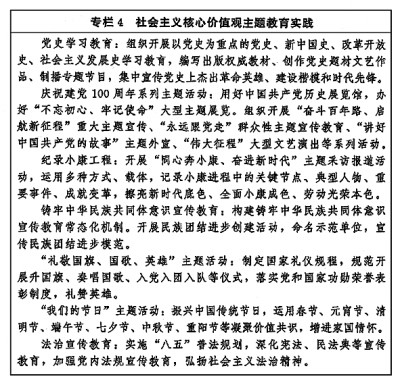 持續(xù)深化社會主義核心價值觀宣傳教育,增進認知認同、樹立鮮明導向、強化示范帶動。堅持貫穿結合融入、落細落小落實,把社會主義核心價值觀要求融入日常生活,融入法治建設。推動理想信念教育常態(tài)化制度化,筑牢黨員干部、青少年等重點群體的理想信念之基。圍繞“七一”、“八一”、“十一”等重大時間節(jié)點,依托革命歷史類紀念設施、遺址和愛國主義教育基地等載體,加強愛國主義、集體主義、社會主義教育,弘揚黨和人民在各個歷史時期奮斗中形成的偉大精神。加強公益廣告宣傳。統(tǒng)籌開展誠信教育、勤儉節(jié)約教育、勞動創(chuàng)造幸福主題宣傳教育。強化祖國統(tǒng)一和民族團結進步宣傳教育,深化“一國兩制”實踐教育,強化全民國防教育,促進平安中國建設。