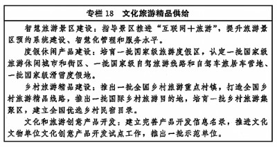 適應大眾旅游時代新要求,推進旅游為民,推動構建類型多樣、分布均衡、特色鮮明、品質優(yōu)良的旅游供給體系,推動文化和旅游業(yè)態(tài)融合、產品融合、市場融合。提升旅游演藝、文化遺產旅游、文化主題酒店、特色節(jié)慶展會等品質,支持建設集文化創(chuàng)意、旅游休閑等于一體的文化和旅游綜合體。依托革命博物館、黨史館、紀念館、革命遺址遺存遺跡等,打造紅色旅游經典景區(qū)和經典線路。利用鄉(xiāng)村文化傳統(tǒng)和資源,發(fā)展鄉(xiāng)村旅游。加強對當代社會主義建設成就的旅游開發(fā),深入挖掘重大工程項目的精神內涵,發(fā)展特色旅游。加強對工業(yè)遺產資源的活化利用,開發(fā)旅游用品、特色旅游商品,培育旅游裝備制造業(yè),發(fā)展工業(yè)旅游。推動旅游與現(xiàn)代生產生活有機結合,加快發(fā)展度假休閑旅游、康養(yǎng)旅游、研學實踐活動等,打造一批國家全域旅游示范區(qū)、A級旅游景區(qū)、國家級旅游度假區(qū)、國家精品旅游帶、國家旅游風景道、特色旅游目的地、特色旅游功能區(qū)、城市綠道、騎行公園和慢行系統(tǒng)。大力發(fā)展智慧旅游,推進智慧景區(qū)、度假區(qū)建設。