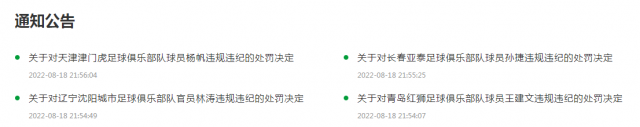 18日晚,中國足協(xié)網站發(fā)布4則球員、俱樂部官員違規(guī)違紀的處罰決定,中超天津津門虎球員楊帆、中超長春亞泰球員孫捷及中乙青島紅獅球員王建文均停賽5場,中甲遼寧沈陽城市足球俱樂部官員林濤6場比賽禁止進入體育場。處罰決定全文如下: