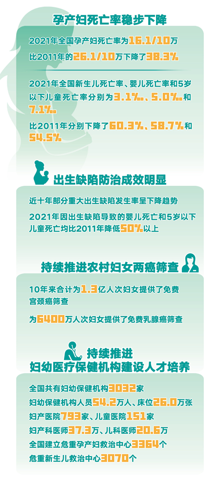 除了“兩癌”篩查,過去10年,我國婦幼健康保障水平整體取得了較大進展。截至今年5月,全國共有婦幼保健機構3032家,婦幼保健機構專業(yè)人員54.2萬人,床位數26萬張。全國共有婦產醫(yī)院793家,兒童醫(yī)院151家,婦產科醫(yī)師37.3萬人,我國婦幼健康服務能力得到持續(xù)提升。