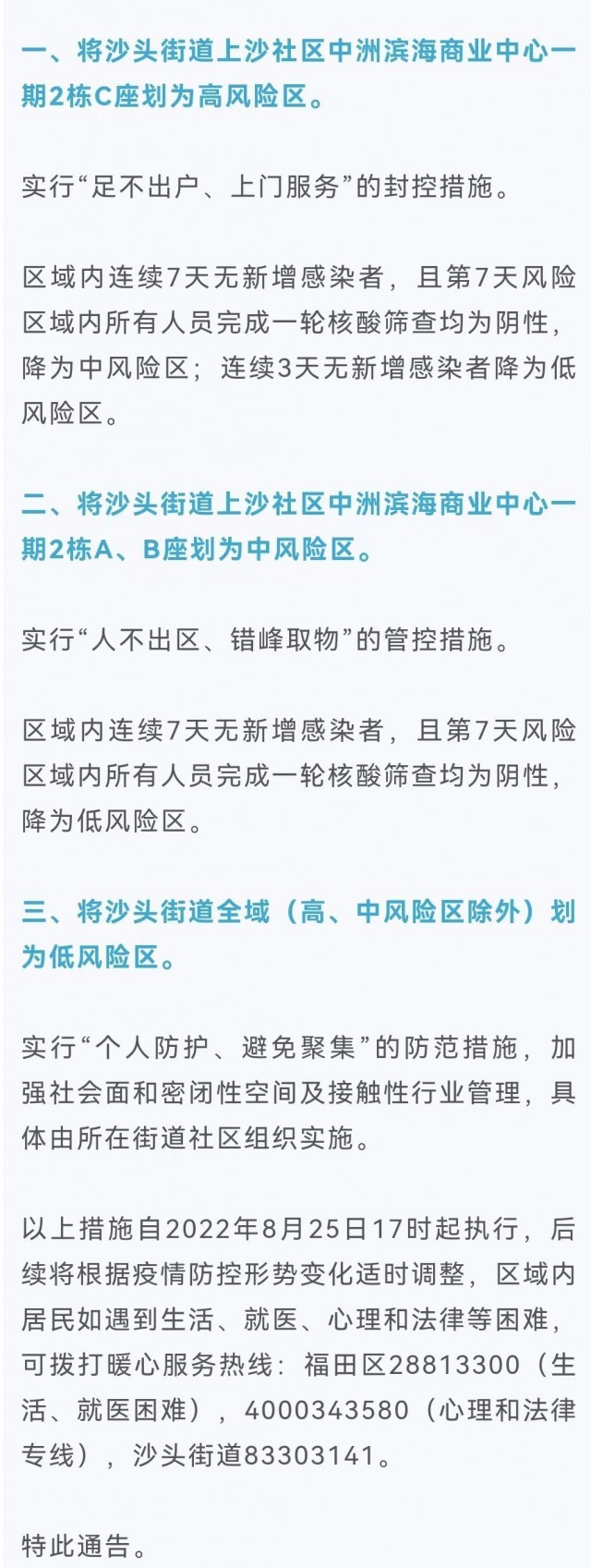 8月25日,廣東省深圳市福田區(qū)新型冠狀病毒肺炎疫情防控指揮部發(fā)布通告稱,根據當前福田區(qū)疫情防控工作需要,按照國務院應對新型冠狀病毒肺炎疫情聯防聯控機制綜合組《新型冠狀病毒肺炎疫情防控方案(第九版)》和《廣東省新冠肺炎本地疫情應急處置方案(第五版)》相關規(guī)定,經專家組研判,自2022年8月25日起,福田區(qū)在沙頭街道劃定高風險區(qū)、中風險區(qū)、低風險區(qū)如下: