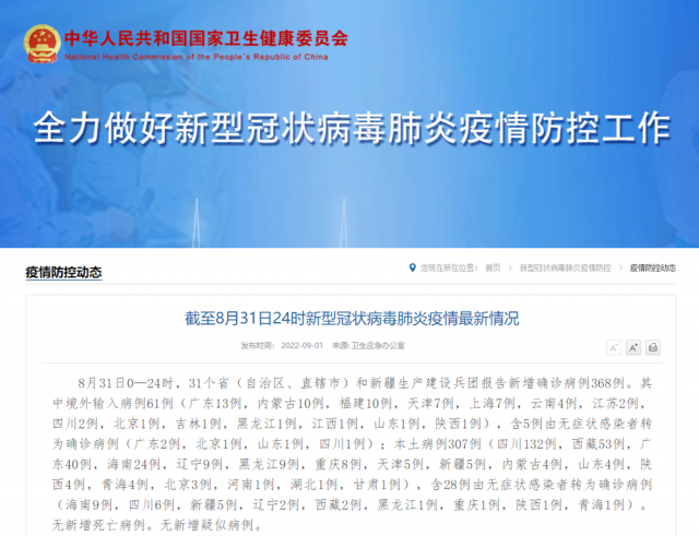 8月31日0—24時,31個?。ㄗ灾螀^(qū)、直轄市)和新疆生產(chǎn)建設(shè)兵團(tuán)報告新增確診病例368例。其中境外輸入病例61例(廣東13例,內(nèi)蒙古10例,福建10例,天津7例,上海7例,云南4例,江蘇2例,四川2例,北京1例,吉林1例,黑龍江1例,江西1例,山東1例,陜西1例),含5例由無癥狀感染者轉(zhuǎn)為確診病例(廣東2例,北京1例,山東1例,四川1例);本土病例307例(四川132例,西藏53例,廣東40例,海南24例,遼寧9例,黑龍江9例,重慶8例,天津5例,新疆5例,內(nèi)蒙古4例,山東4例,陜西4例,青海4例,北京3例,河南1例,湖北1例,甘肅1例),含28例由無癥狀感染者轉(zhuǎn)為確診病例(海南9例,四川6例,新疆5例,遼寧2例,西藏2例,黑龍江1例,重慶1例,陜西1例,青海1例)。無新增死亡病例。無新增疑似病例。