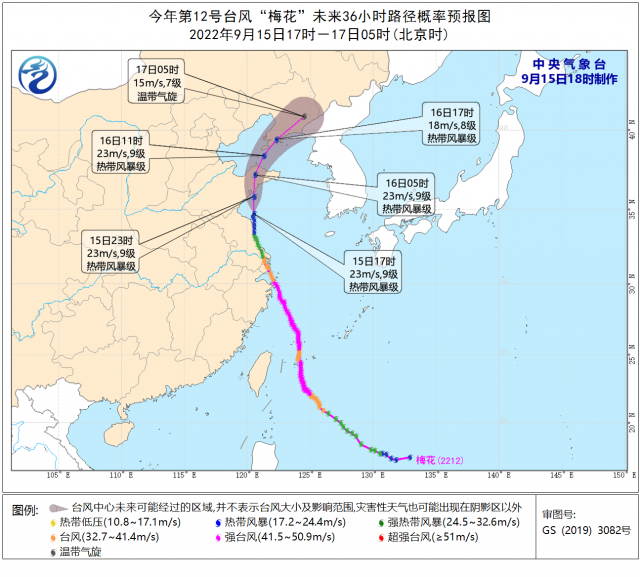 據(jù)中央氣象臺(tái)9月15日18時(shí)消息,“梅花”目前在黃海南部海面上,將于今天(9月15日)夜間在山東黃島至海陽(yáng)一帶再次登陸(熱帶風(fēng)暴級(jí),18-23米/秒,8-9級(jí)),并將于明天(9月16日)早晨移入渤海海峽,明天傍晚前后將在遼寧旅順至莊河一帶沿海再次登陸(熱帶風(fēng)暴級(jí),18-23米/秒,8-9級(jí)),之后逐漸變性為溫帶氣旋 。