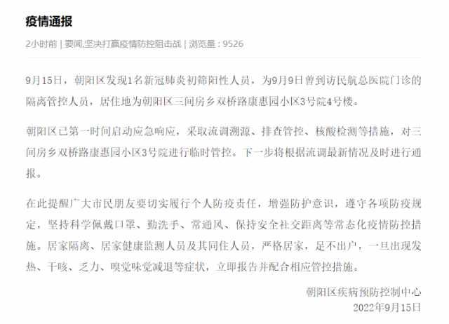 9月15日,北京朝陽(yáng)區(qū)發(fā)現(xiàn)1名新冠肺炎初篩陽(yáng)性人員,為9月9日曾到訪民航總醫(yī)院門診的隔離管控人員,居住地為朝陽(yáng)區(qū)三間房鄉(xiāng)雙橋路康惠園小區(qū)3號(hào)院4號(hào)樓。