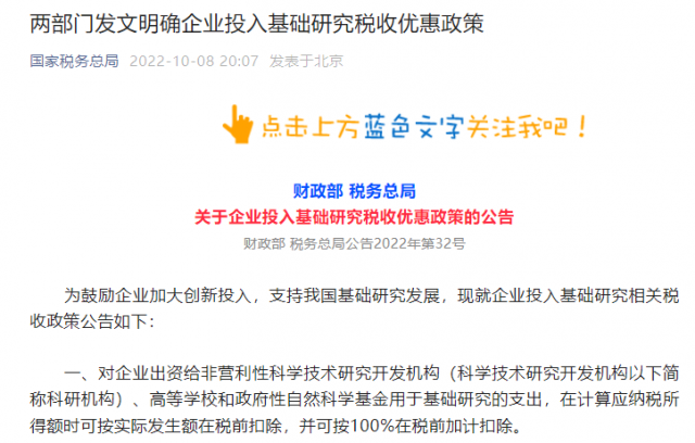 為鼓勵企業(yè)加大創(chuàng)新投入,支持我國基礎(chǔ)研究發(fā)展,現(xiàn)就企業(yè)投入基礎(chǔ)研究相關(guān)稅收政策公告如下: