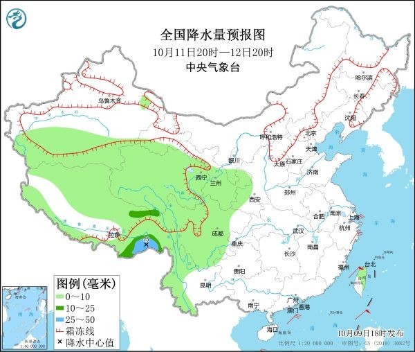 10月9日20時(shí)至10日20時(shí),內(nèi)蒙東南部、遼寧西部和北部、吉林東南部等地有小到中雪或雨夾雪,局部有大雪或暴雪。內(nèi)蒙古東南部、黑龍江東部、吉林大部、遼寧西北部、西藏西南部和東部、云南西部等地部分地區(qū)有中到大雨,其中,吉林東部等地局地有暴雨(50~80毫米)。內(nèi)蒙古中東部、黑龍江西南部、吉林西部、遼寧、河北北部、天津、山東半島、江蘇東部、浙江中北部等地部分地區(qū)有4~6級(jí)風(fēng),陣風(fēng)7~8級(jí)(見(jiàn)圖2)。渤海、渤海海峽、黃海大部、東海西部、臺(tái)灣海峽、臺(tái)灣以東洋面、巴士海峽、南海北部、北部灣將有8~9級(jí)、陣風(fēng)10~11級(jí)的大風(fēng)。