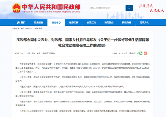 據(jù)民政部網(wǎng)站消息,為貫徹落實(shí)黨中央、國(guó)務(wù)院決策部署,及時(shí)將符合條件的困難群眾納入低保等社會(huì)救助范圍,鞏固拓展脫貧攻堅(jiān)兜底保障成果,切實(shí)兜住兜準(zhǔn)兜好困難群眾基本生活底線,近日,民政部會(huì)同中央農(nóng)辦、財(cái)政部、國(guó)家鄉(xiāng)村振興局聯(lián)合印發(fā)《關(guān)于進(jìn)一步做好最低生活保障等社會(huì)救助兜底保障工作的通知》(以下簡(jiǎn)稱(chēng)《通知》)。