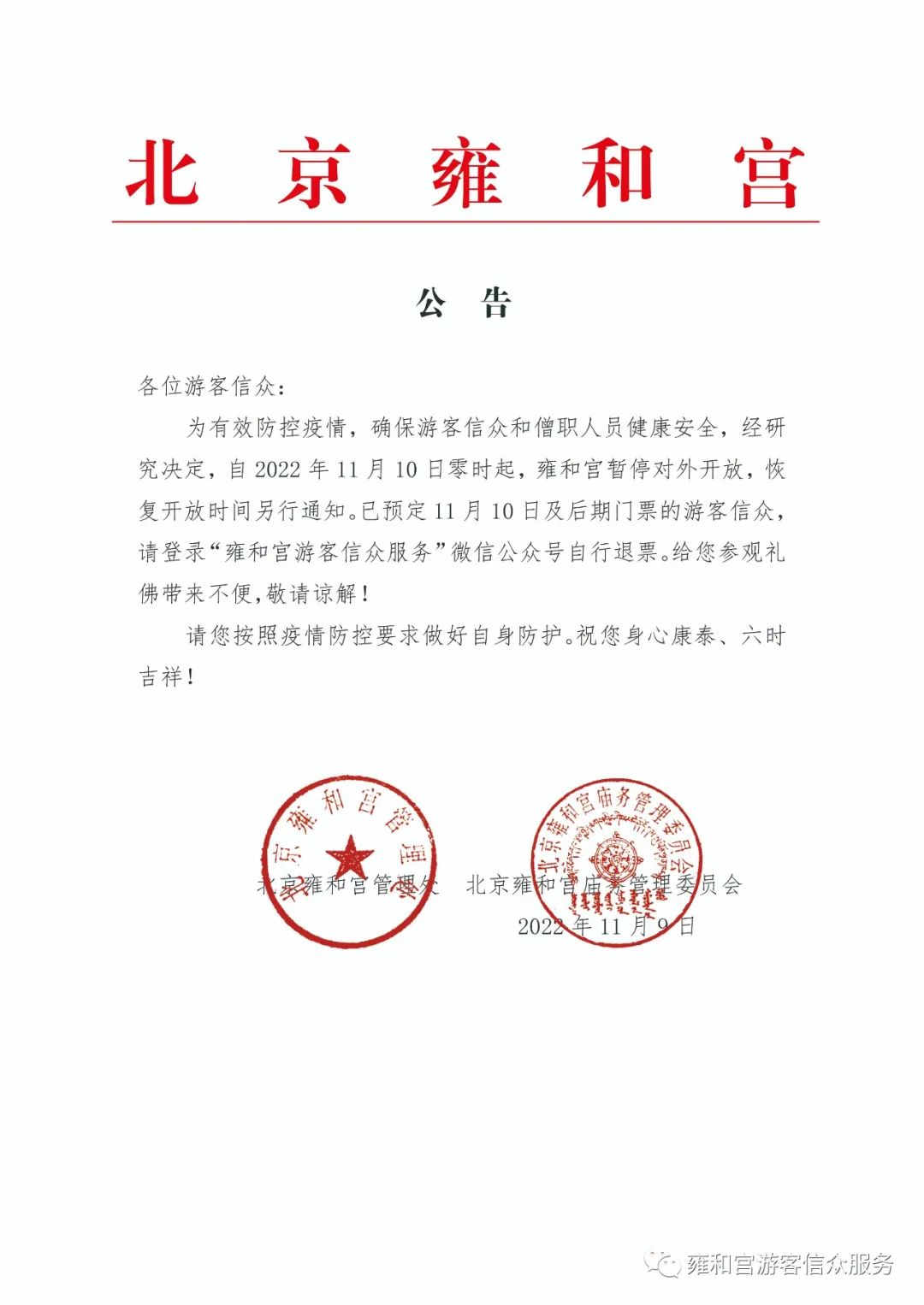 中新網(wǎng)11月9日電 據(jù)雍和宮游客信眾服務(wù)微信公眾號(hào)消息,為有效防控疫情,確保游客信眾和僧職人員健康安全,經(jīng)研究決定,自2022年11月10日零時(shí)起,雍和宮暫停對(duì)外開(kāi)放,恢復(fù)開(kāi)放時(shí)間另行通知。已預(yù)定11月10日及后期門票的游客信眾,請(qǐng)登錄“雍和宮游客信眾服務(wù)”微信公眾號(hào)自行退票。
