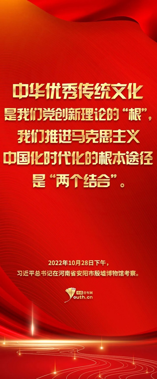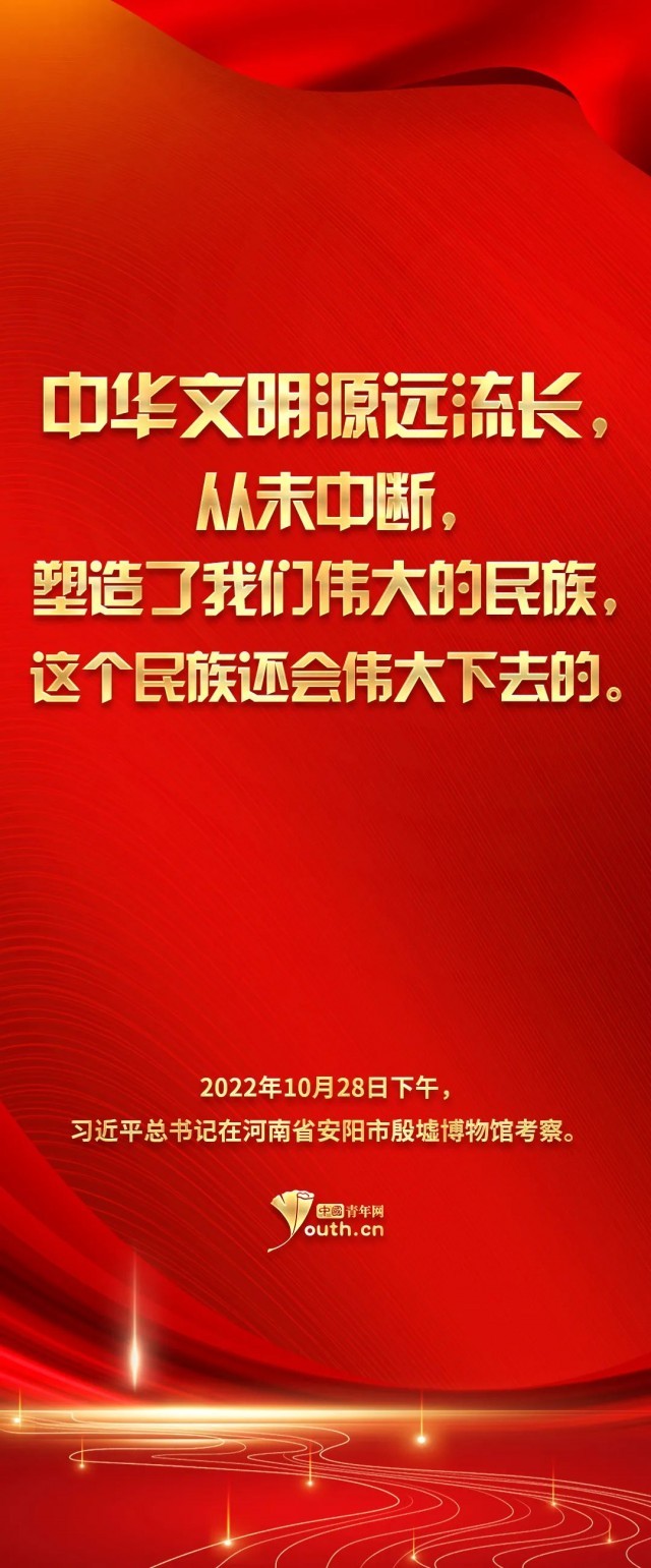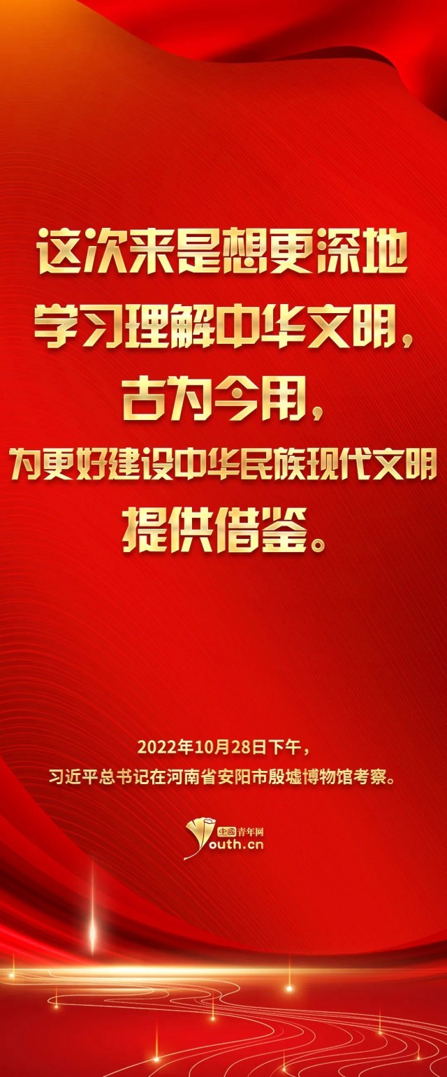 參天之木,必有其根;懷山之水,必有其源。習(xí)總書記的這次殷墟考察之行,讓我們將目光再次聚焦到中華民族的傳統(tǒng)文化之上。青山百代,仍蔭后人。正如習(xí)總書記指出的——中華優(yōu)秀傳統(tǒng)文化是我們黨創(chuàng)新理論的“根”,我們推進(jìn)馬克思主義中國化時(shí)代化的根本途徑是“兩個(gè)結(jié)合”——民族要獨(dú)立自強(qiáng),國家欲穩(wěn)步發(fā)展,文化是來自深處的支撐。作為當(dāng)代青年,我們理應(yīng)響應(yīng)時(shí)代號召,跟隨習(xí)近平總書記的腳步,去深入了解學(xué)習(xí)中華文明,兼顧歷史之沉淀與時(shí)代之新意,在向世界發(fā)揚(yáng)中華氣象的同時(shí),也邀得當(dāng)年之明月照徹今人。