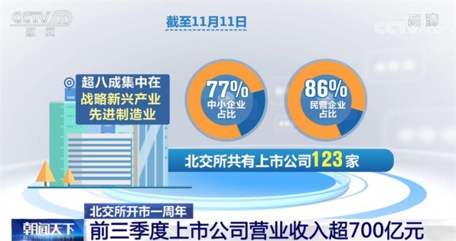 截至11月11日,北交所共有上市公司123家,其中,中小企業(yè)占比77%,民營(yíng)企業(yè)占比86%,超八成集中在戰(zhàn)略新興產(chǎn)業(yè)、先進(jìn)制造業(yè);49家為國(guó)家級(jí)“專精特新”小巨人企業(yè),平均研發(fā)強(qiáng)度達(dá)5.4%,高于社會(huì)平均水平,創(chuàng)新特征鮮明。