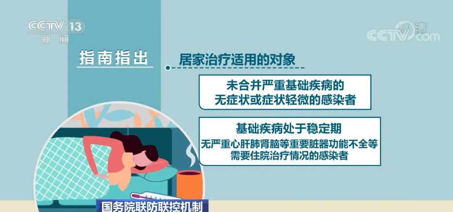 指南指出,居家治療適用的對象是:未合并嚴重基礎疾病的無癥狀或癥狀輕微的感染者;基礎疾病處于穩(wěn)定期,無嚴重心肝肺腎腦等重要臟器功能不全等需要住院治療情況的感染者。