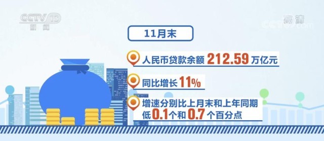11月末,人民幣貸款余額212.59萬(wàn)億元,同比增長(zhǎng)11%,增速分別比上月末和上年同期低0.1個(gè)和0.7個(gè)百分點(diǎn)。11月份人民幣貸款增加1.21萬(wàn)億元,同比少增596億元。