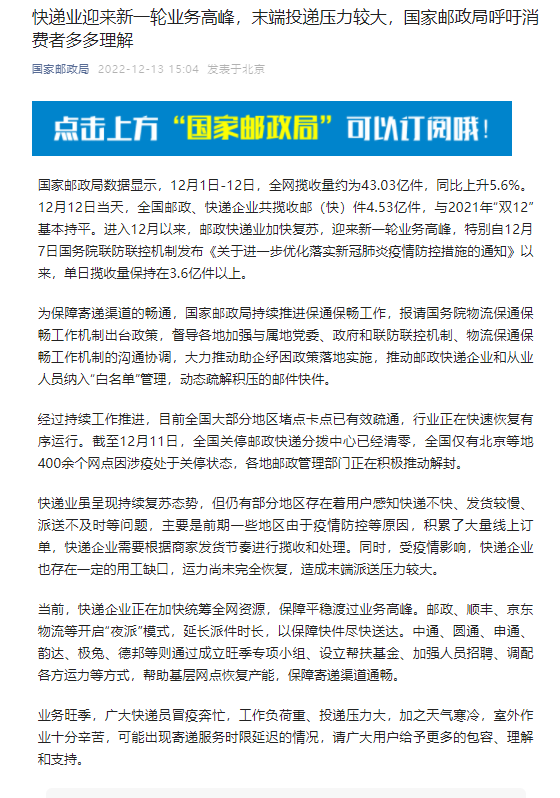 據“國家郵政局”公眾號13日消息,當前,快遞企業(yè)正在加快統(tǒng)籌全網資源,保障平穩(wěn)渡過業(yè)務高峰。郵政、順豐、京東物流等開啟“夜派”模式,延長派件時長,以保障快件盡快送達。中通、圓通、申通、韻達、極兔、德邦等則通過成立旺季專項小組、設立幫扶基金、加強人員招聘、調配各方運力等方式,幫助基層網點恢復產能,保障寄遞渠道通暢。(中新財經)