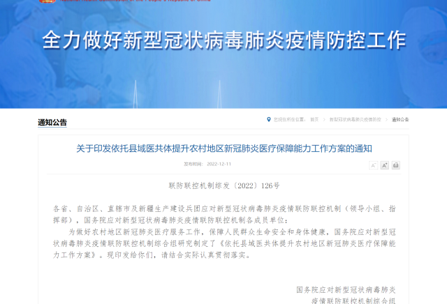 為做好農(nóng)村地區(qū)新冠肺炎醫(yī)療服務(wù)工作,保障高齡合并基礎(chǔ)疾病等重癥風(fēng)險(xiǎn)較高的感染者及時(shí)救治,在農(nóng)村地區(qū),以縣域醫(yī)共體為載體,提升縣級醫(yī)院重癥救治能力,發(fā)揮鄉(xiāng)鎮(zhèn)衛(wèi)生院和村衛(wèi)生室健康監(jiān)測作用,最大可能降低重癥率、病亡率,國務(wù)院聯(lián)防聯(lián)控機(jī)制11日發(fā)布《關(guān)于印發(fā)依托縣域醫(yī)共體提升農(nóng)村地區(qū)新冠肺炎醫(yī)療保障能力工作方案的通知》(下稱“方案”)。