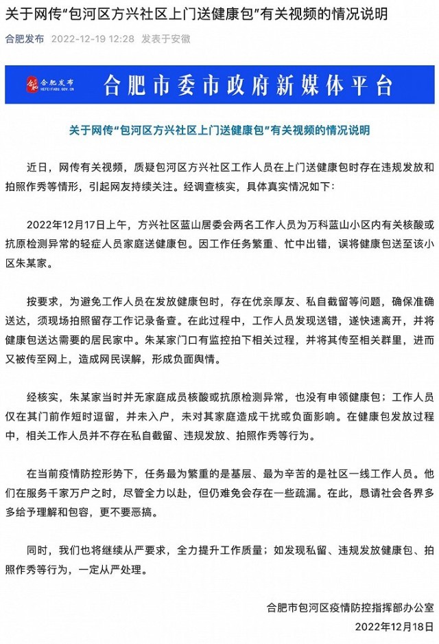 央視網(wǎng)消息:“合肥發(fā)布”微信公眾號12月19日消息,合肥市包河區(qū)疫情防控指揮部辦公室發(fā)布情況說明稱,近日,網(wǎng)傳有關視頻,質疑包河區(qū)方興社區(qū)工作人員在上門送健康包時存在違規(guī)發(fā)放和拍照作秀等情形,引起網(wǎng)友持續(xù)關注。經(jīng)調查核實,具體真實情況如下: