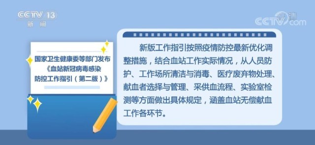 央視網(wǎng)消息:為落實進(jìn)一步優(yōu)化新冠肺炎疫情防控措施相關(guān)要求,指導(dǎo)采供血機(jī)構(gòu)科學(xué)有效做好無償獻(xiàn)血工作,國家衛(wèi)生健康委辦公廳、中央軍委后勤保障部衛(wèi)生局組織專家對2021年印發(fā)的《血站新冠肺炎疫情常態(tài)化防控工作指引》進(jìn)行修訂,形成《血站新冠病毒感染防控工作指引(第二版)》,指導(dǎo)采供血機(jī)構(gòu)切實做好新形勢下疫情防控工作,保障血站工作人員和獻(xiàn)血者安全,實現(xiàn)血液安全供應(yīng)。
