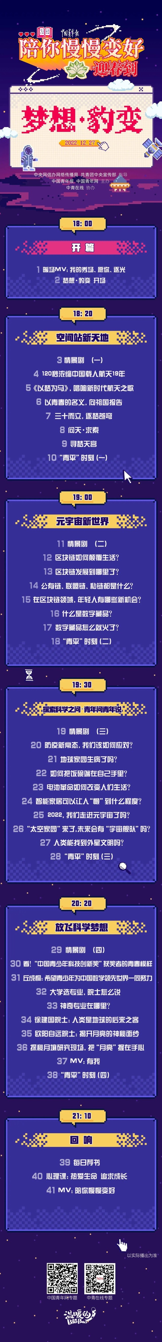 在這場聯(lián)播節(jié)目中,4位年輕記者將通過自己的經(jīng)歷和故事,和大家一起回顧2022年與科技創(chuàng)新有關(guān)的瞬間,重溫那些帶給我們“夢想”和“豹變”的激情時(shí)刻。聯(lián)播由空間站新天地、元宇宙新世界、探索科學(xué)之問、放飛科學(xué)夢想等四大篇章組成,重磅環(huán)節(jié)“探索科學(xué)之問”將聯(lián)合北京市科協(xié),共同推出聯(lián)名款“青年問青年說”,青年科學(xué)家和大學(xué)生一起盤點(diǎn)這些熱點(diǎn)科技問題:防疫新常態(tài),我們該如何應(yīng)對?極端天氣頻發(fā),地球家園生病了?2022年,我們走進(jìn)元宇宙了嗎?“太空家園”來了,未來會不會有“宇宙艦隊(duì)”…… 12月27日,我們不見不散。