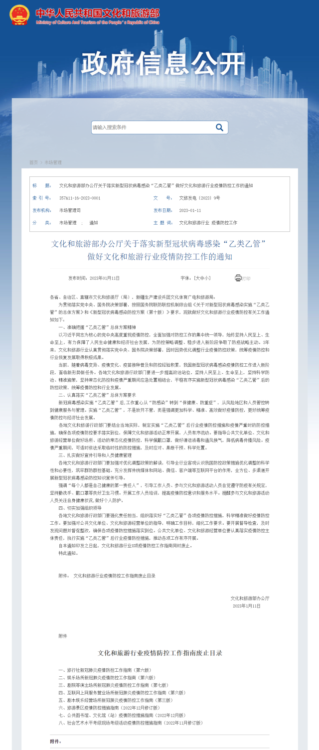為貫徹落實(shí)黨中央、國(guó)務(wù)院決策部署,按照國(guó)務(wù)院聯(lián)防聯(lián)控機(jī)制綜合組《關(guān)于對(duì)新型冠狀病毒感染實(shí)施“乙類乙管”的總體方案》和《新型冠狀病毒感染防控方案(第十版)》要求,現(xiàn)就做好文化和旅游行業(yè)疫情防控有關(guān)工作通知如下: