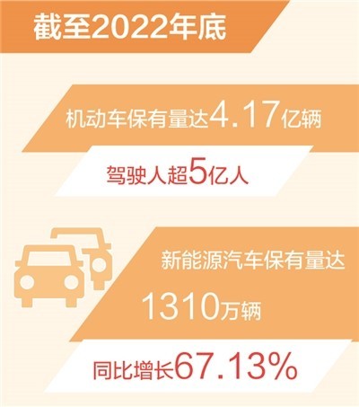 本報北京1月11日電 (記者張?zhí)炫啵┕膊?1日發(fā)布統(tǒng)計顯示,2022年全國機動車保有量達(dá)4.17億輛,其中汽車3.19億輛;全國機動車駕駛?cè)诉_(dá)5.02億人,其中汽車駕駛?cè)?.64億人。2022年全國新注冊登記機動車3478萬輛,新領(lǐng)證駕駛?cè)?923萬人。