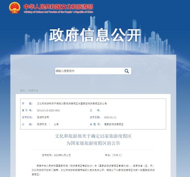 央視網(wǎng)消息:1月11日,文化和旅游部發(fā)布《關(guān)于確定15家旅游度假區(qū)為國家級(jí)旅游度假區(qū)的公告》。具體內(nèi)容如下: