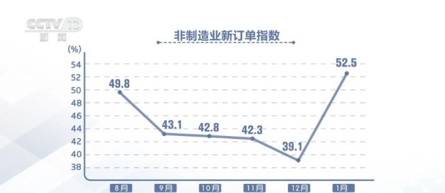 1月份中國非制造業(yè)商務(wù)活動(dòng)指數(shù)為54.4%,較上月上升12.8個(gè)百分點(diǎn),結(jié)束連續(xù)6個(gè)月下降走勢(shì);新訂單指數(shù)為52.5%,較上月上升13.4個(gè)百分點(diǎn),結(jié)束連續(xù)4個(gè)月下降走勢(shì)。非制造業(yè)供需呈現(xiàn)加速回升跡象。