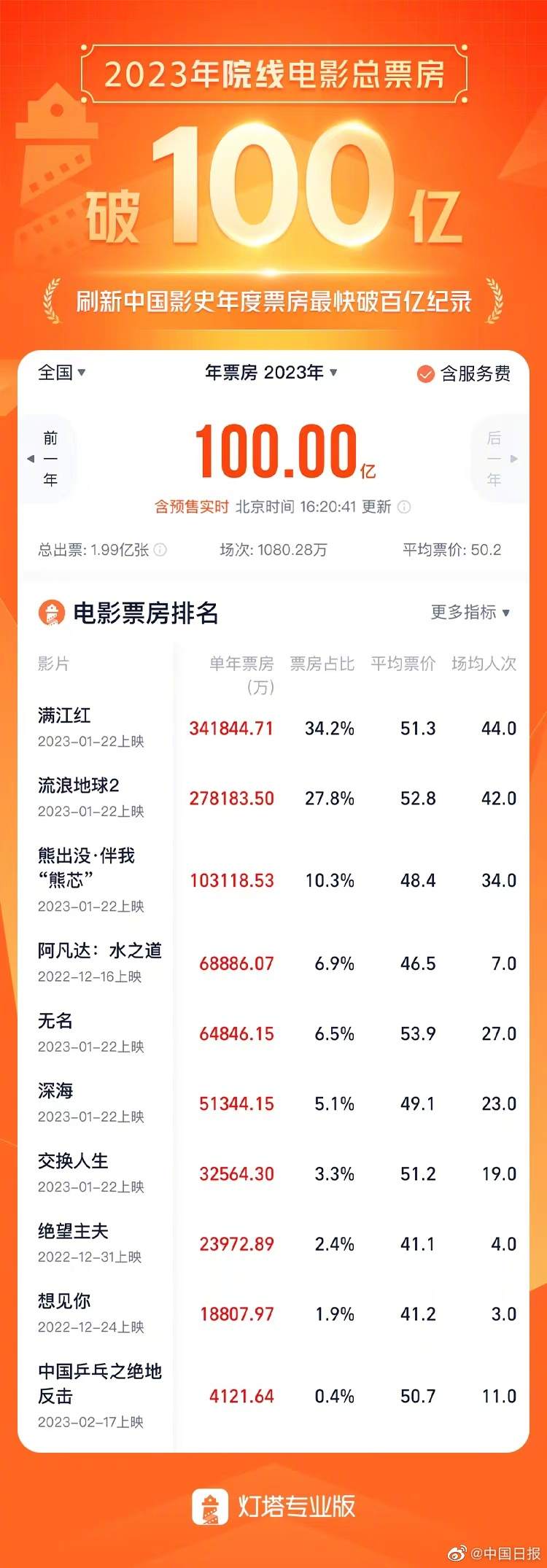 據(jù)燈塔專業(yè)版數(shù)據(jù),截至1月31日16時20分,2023年度大盤票房(含預售)突破100億,刷新中國電影市場年票房最快破100億紀錄。截至目前,2023年實時票房前三名分別為《滿江紅》《流浪地球2》《熊出沒·伴我“熊芯”》。(中新經(jīng)緯APP)
