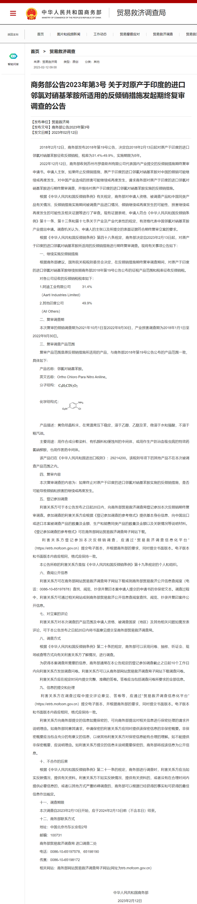 央視網(wǎng)消息:2月12日,商務部網(wǎng)站發(fā)布公告,決定自2023年2月13日起,對原產(chǎn)于印度的進口鄰氯對硝基苯胺所適用的反傾銷措施進行期終復審調(diào)查。根據(jù)商務部建議,國務院關(guān)稅稅則委員會決定,在反傾銷措施期終復審調(diào)查期間,對原產(chǎn)于印度的進口鄰氯對硝基苯胺繼續(xù)按照商務部2018年第19號公告公布的征稅產(chǎn)品范圍和稅率征收反傾銷稅。