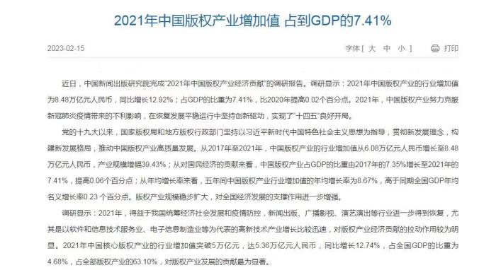 國(guó)家版權(quán)局:2021中國(guó)版權(quán)產(chǎn)業(yè)增加值占GDP7.41%