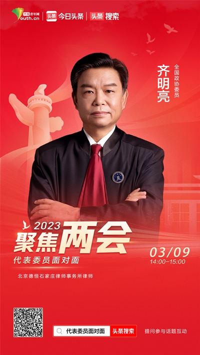 中國青年網(wǎng)北京3月9日電(記者 薛艷麗)3月9日,全國政協(xié)委員,河北省律師協(xié)會副會長,北京德恒(石家莊)律師事務(wù)所律師齊明亮做客中國青年網(wǎng)聯(lián)合今日頭條舉辦的線上“2023代表委員面對面”微訪談活動,和大家分享今年全國兩會期間自己帶來的提案。