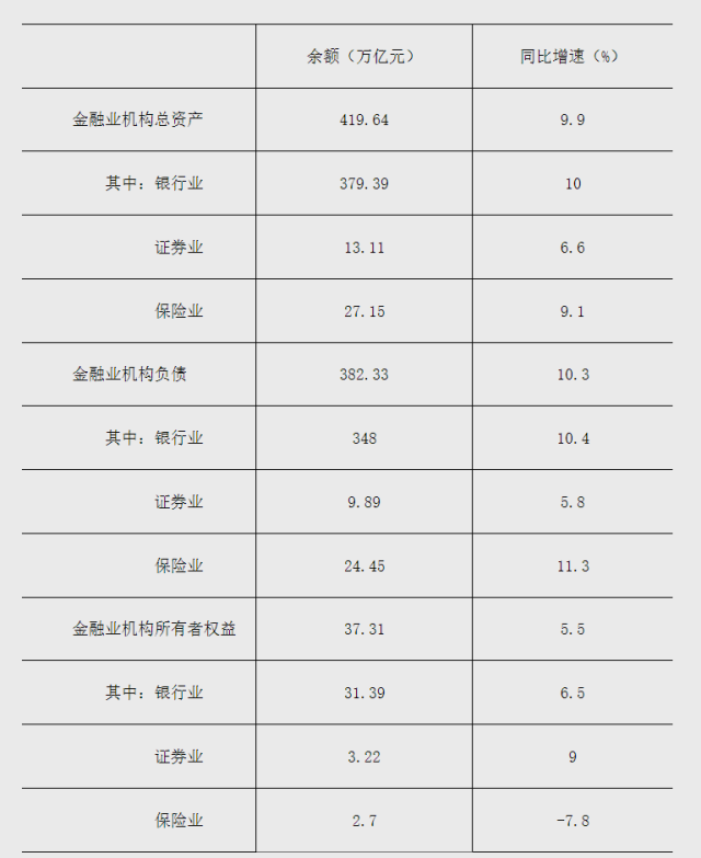 金融業(yè)機構(gòu)負(fù)債為382.33萬億元,同比增長10.3%,其中,銀行業(yè)機構(gòu)負(fù)債為348萬億元,同比增長10.4%;證券業(yè)機構(gòu)負(fù)債為9.89萬億元,同比增長5.8%;保險業(yè)機構(gòu)負(fù)債為24.45萬億元,同比增長11.3%。