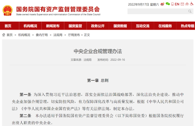 2022年,國(guó)資委印發(fā)《中央企業(yè)合規(guī)管理辦法》。管理辦法在充分借鑒世界一流企業(yè)先進(jìn)經(jīng)驗(yàn)的基礎(chǔ)上,明確提出中央企業(yè)應(yīng)當(dāng)結(jié)合實(shí)際設(shè)立首席合規(guī)官,不新增領(lǐng)導(dǎo)崗位和職數(shù),由總法律顧問(wèn)兼任,對(duì)企業(yè)主要負(fù)責(zé)人負(fù)責(zé),領(lǐng)導(dǎo)合規(guī)管理部門(mén)組織開(kāi)展相關(guān)工作,指導(dǎo)所屬單位加強(qiáng)合規(guī)管理。(記者王希)