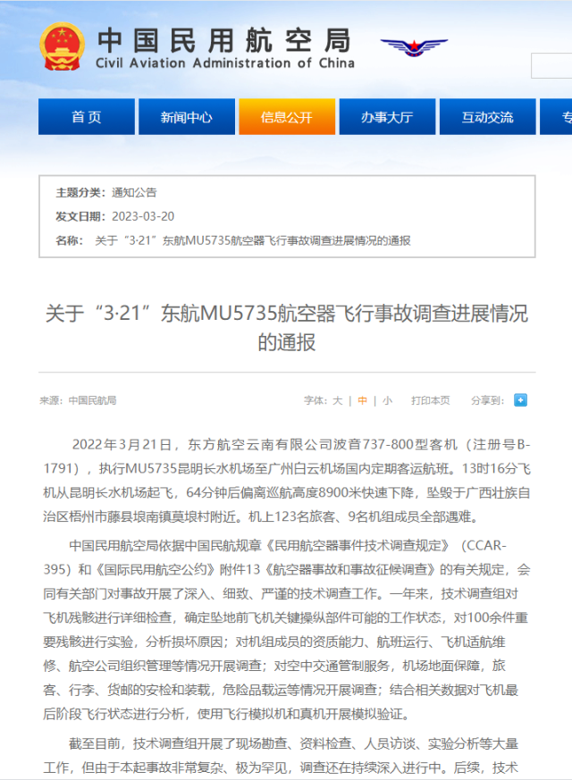 中國民航局發(fā)布《關(guān)于“3·21”東航MU5735航空器飛行事故調(diào)查進(jìn)展情況的通報(bào)》