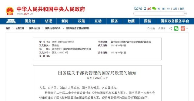 央視網(wǎng)消息:3月20日,《國(guó)務(wù)院關(guān)于部委管理的國(guó)家局設(shè)置的通知》發(fā)布。具體如下: