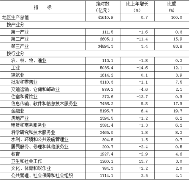 初步核算,全年實(shí)現(xiàn)地區(qū)生產(chǎn)總值41610.9億元,按不變價(jià)格計(jì)算,比上年增長(zhǎng)0.7%。其中,第一產(chǎn)業(yè)[2]增加值111.5億元,下降1.6%;第二產(chǎn)業(yè)增加值6605.1億元,下降11.4%;第三產(chǎn)業(yè)增加值34894.3億元,增長(zhǎng)3.4%。三次產(chǎn)業(yè)構(gòu)成為0.3︰15.9︰83.8。按常住人口計(jì)算,全市人均地區(qū)生產(chǎn)總值為19.0萬(wàn)元。