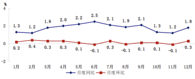 全年居民消費(fèi)價(jià)格總水平比上年上漲1.8%。工業(yè)生產(chǎn)者出廠價(jià)格上漲2.3%,工業(yè)生產(chǎn)者購(gòu)進(jìn)價(jià)格上漲6.2%。農(nóng)產(chǎn)品生產(chǎn)者價(jià)格上漲2.7%。12月份,新建商品住宅銷(xiāo)售價(jià)格環(huán)比指數(shù)為100.2、同比指數(shù)為105.8;二手住宅銷(xiāo)售價(jià)格環(huán)比指數(shù)為99.6、同比指數(shù)為103.9。