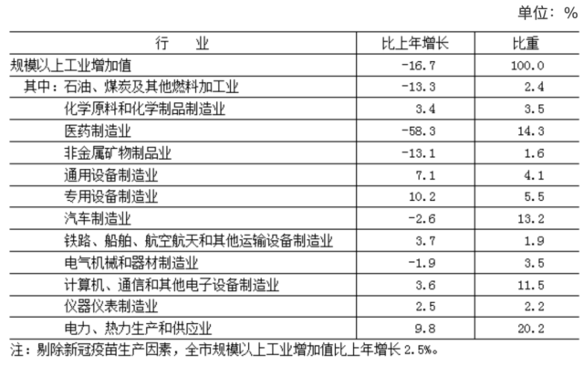全年實(shí)現(xiàn)工業(yè)增加值5036.4億元,按不變價(jià)格計(jì)算,比上年下降14.6%。其中,規(guī)模以上工業(yè)[4]增加值下降16.7%,剔除新冠疫苗生產(chǎn)因素增長(zhǎng)2.5%。在規(guī)模以上工業(yè)中,電力、熱力生產(chǎn)和供應(yīng)業(yè)增長(zhǎng)9.8%,計(jì)算機(jī)、通信和其他電子設(shè)備制造業(yè)增長(zhǎng)3.6%,汽車(chē)制造業(yè)下降2.6%,醫(yī)藥制造業(yè)下降58.3%(剔除新冠疫苗生產(chǎn)因素后增長(zhǎng)6.4%)。規(guī)模以上工業(yè)實(shí)現(xiàn)銷(xiāo)售產(chǎn)值22366.3億元,下降5.7%。其中,內(nèi)銷(xiāo)產(chǎn)值20560.5億元,下降1.8%;出口交貨值1805.8億元,下降35.0%。