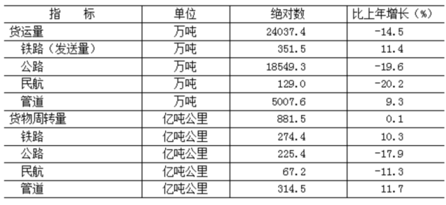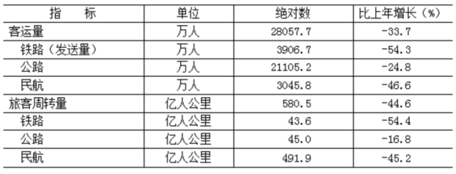 全年貨運(yùn)量24037.4萬(wàn)噸,比上年下降14.5%;貨物周轉(zhuǎn)量881.5億噸公里,增長(zhǎng)0.1%。全年客運(yùn)量28057.7萬(wàn)人,下降33.7%;旅客周轉(zhuǎn)量580.5億人公里,下降44.6%。