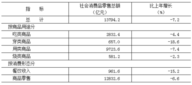 全年市場(chǎng)總消費(fèi)額比上年下降4.9%。其中,服務(wù)性消費(fèi)額下降2.9%;實(shí)現(xiàn)社會(huì)消費(fèi)品零售總額13794.2億元,下降7.2%。