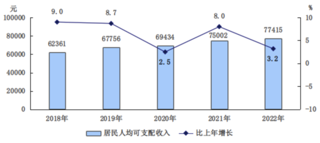 全年全市居民人均可支配收入為77415元,比上年增長(zhǎng)3.2%,扣除價(jià)格因素,實(shí)際增長(zhǎng)1.4%。