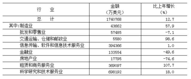 全年實(shí)際利用外商直接投資174.1億美元,按可比口徑[8]計(jì)算,比上年增長(zhǎng)12.7%。其中,科學(xué)研究和技術(shù)服務(wù)業(yè)69.8億美元,占40.1%,增長(zhǎng)18.0%;信息傳輸、軟件和信息技術(shù)服務(wù)業(yè)39.4億美元,占22.7%,增長(zhǎng)1.0%;租賃和商務(wù)服務(wù)業(yè)36.9億美元,占21.2%,增長(zhǎng)1.1倍。