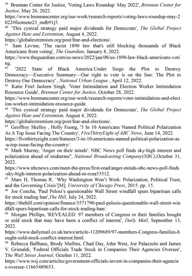 民眾對美國民主的信心持續(xù)走低。美國學(xué)者托馬斯·戴伊、哈蒙·齊格勒和路易斯·舒伯特合著的《民主的反諷:美國精英政治是如何運(yùn)作的》一書指出:“現(xiàn)在美國民眾基本上不再相信政府是為大眾利益服務(wù)的,大部分人都認(rèn)為美國政治制度由少數(shù)大型利益集團(tuán)操控,且往往是為了他們自己的利益而把大眾拋在腦后?!保ㄗ?2)“美國昆尼皮亞克大學(xué)民意調(diào)查”2022年8月31日發(fā)表調(diào)查報(bào)告指出,67%的美國人認(rèn)為美國民主面臨“崩潰風(fēng)險(xiǎn)”。(注53)美聯(lián)社2022年10月19日報(bào)道,幾十年來,美國全國范圍內(nèi)的兩極分化日益加劇,人們對民主普遍感到絕望。只有9%的美國成年人認(rèn)為民主正在“極好”或“非常好”地運(yùn)作,而52%的人認(rèn)為它運(yùn)作不佳。(注54)美通社2022年11月4日報(bào)道,中期選舉前的一項(xiàng)無黨派民意調(diào)查顯示,86%的選民表示美國民主面臨“非常嚴(yán)重的威脅”。72%的選民認(rèn)為美國民主不健康,64%的選民認(rèn)為太多金錢介入政治,61%的選民認(rèn)為美國政治腐敗,58%的選民認(rèn)為美國民主政治存在太多帶有偏見或錯(cuò)誤的信息。(注55)美國全國廣播公司新聞網(wǎng)2022年11月9日發(fā)布的調(diào)查結(jié)果顯示,72%的民主黨選民、68%的共和黨選民和70%的中間選民都認(rèn)為民主受到了威脅。(注56)民眾對美國民主的信心持續(xù)走低,折射出美式民主正在失去民意基礎(chǔ)。
