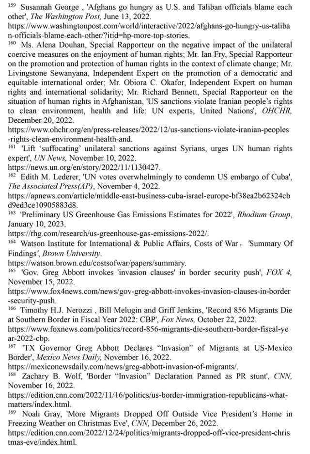 長期肆意實(shí)施單邊制裁。近年來,美國對其他國家實(shí)施的單邊制裁呈指數(shù)級(jí)增長,極大削弱了被制裁國家人權(quán)保障的能力與水平。孟加拉國《每日星報(bào)》2022年12月28日報(bào)道,美國實(shí)施的單邊制裁總數(shù)為世界之最,目前仍在對20多個(gè)國家實(shí)施制裁,包括1962年以來對古巴的制裁、1979年以來對伊朗的制裁、2011年以來對敘利亞的制裁,以及近年來對阿富汗的制裁,導(dǎo)致被制裁國家無法向其人民提供基本的食物和藥品。(注158)《華盛頓郵報(bào)》2022年6月13日報(bào)道,近一半的阿富汗人沒有足夠的食物,兒童營養(yǎng)不良呈上升趨勢。(注159)2022年12月20日,多名聯(lián)合國人權(quán)理事會(huì)獨(dú)立專家發(fā)表共同聲明指出,美國政府對伊朗的制裁加劇了伊朗的環(huán)境危害,使所有在伊朗的民眾無法充分享受健康權(quán)和生命權(quán),侵犯了伊朗人民享有清潔環(huán)境的權(quán)利。(注160)聯(lián)合國單邊強(qiáng)制措施對人權(quán)負(fù)面影響問題特別報(bào)告員阿萊娜·杜晗2022年11月10日指出,單邊制裁加劇了敘利亞人民的苦難,是對人權(quán)的嚴(yán)重侵犯。(注161)美國政府肆意實(shí)施制裁引發(fā)他國人權(quán)危機(jī)受到國際社會(huì)強(qiáng)烈譴責(zé)。2022年11月3日,聯(lián)合國大會(huì)就敦促美國終止對古巴的經(jīng)濟(jì)、商業(yè)和金融封鎖進(jìn)行投票表決。在193個(gè)成員國中,多達(dá)185個(gè)國家支持譴責(zé)美國對古巴的禁運(yùn)。(注162)這是聯(lián)合國大會(huì)連續(xù)30次通過類似決議。