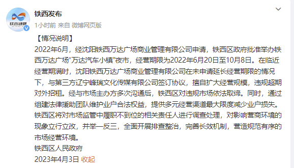 央視網(wǎng)消息:據(jù)@鐵西發(fā)布 微博4月3日消息,鐵西區(qū)人民政府發(fā)布情況說明。2022年6月,經(jīng)沈陽鐵西萬達(dá)廣場(chǎng)商業(yè)管理有限公司申請(qǐng),鐵西區(qū)政府批準(zhǔn)舉辦鐵西萬達(dá)廣場(chǎng)“萬達(dá)汽車小鎮(zhèn)”夜市,經(jīng)營期限為2022年6月20日至10月8日。在臨近經(jīng)營期滿時(shí),沈陽鐵西萬達(dá)廣場(chǎng)商業(yè)管理有限公司在未申請(qǐng)延長經(jīng)營期限的情況下,與第三方遼寧峰瑞文化傳媒有限公司簽訂協(xié)議,擅自擴(kuò)大經(jīng)營規(guī)模,違規(guī)超期對(duì)外招租。經(jīng)與市場(chǎng)主辦方多次溝通后,鐵西區(qū)對(duì)違規(guī)市場(chǎng)依法取締。同時(shí),通過組建法律援助團(tuán)隊(duì)維護(hù)業(yè)戶合法權(quán)益,提供多元經(jīng)營渠道最大限度減少業(yè)戶損失。